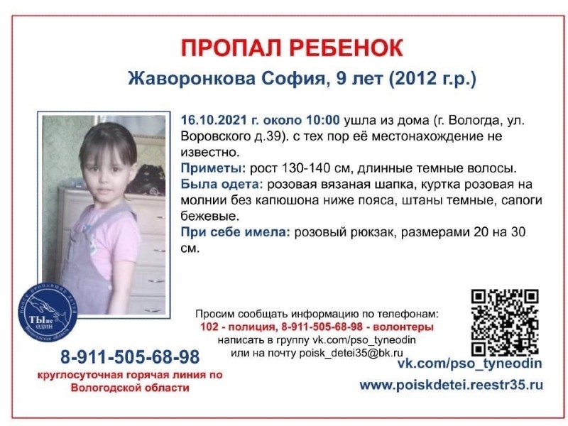 Приметы Софии Жаворонковой: рост 130-140 см, длинные темные волосы, была одета в розовую куртку и такого же цвета шапку, на ногах бежевые сапоги. С собой у ребенка был рюкзак.