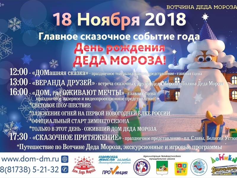 Ежегодно 18 ноября празднуется День рождения Российского Деда Мороза. Сегодня в и его резиденции, а также по всему Великому Устюгу пройдут праздничные мероприятия.