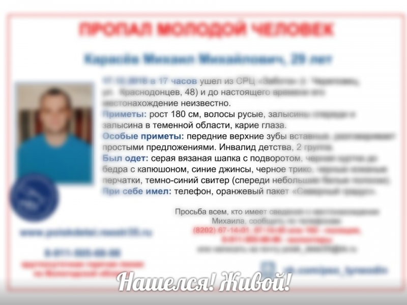 В Череповце найден живым и здоровым 29-летний инвалид детства второй группы, который потерялся вечером 17 декабря. Напомним, молодой человек около пяти часов вышел из социально-реабилитационного центра на улице Краснодонцев и бесследно пропал. На поиски были подняты волонтеры и полиция.