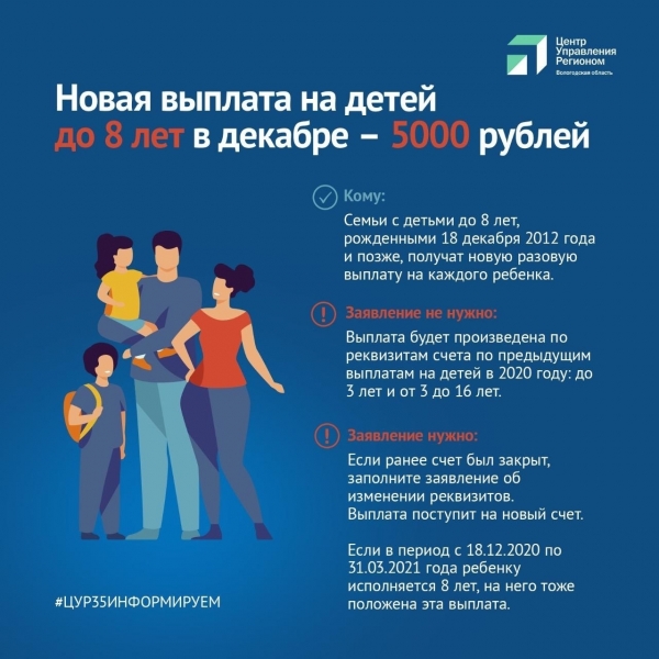 Право на выплату имеют и семьи, где ребенку исполнилось 8 лет с 18 декабря до 31 марта 2021 года, сообщает ИА "СеверИнформ".