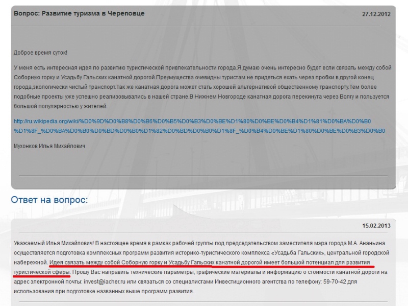 Градоначальник назвал эту идею имеющей «большой потенциал для развития туристической сферы». «Прошу Вас направить технические параметры, графические материалы и информацию о стоимости канатной дороги или связаться со специалистами Инвестиционного агентства для использования при подготовке названных выше программ развития», - говорится в ответном сообщении на сайте.