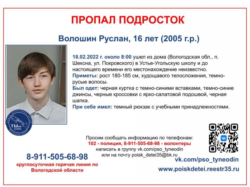 В Шексне подросток ушел в школу и пропал Фото:ПСО "Ты не один"
