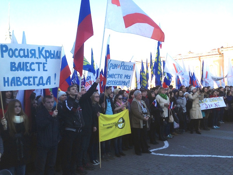 По оценкам правоохранительных органов, в митинге на Кремлевской площади приняли участие около 4000 человек. Все они приняли участие во флешмобе. НА брусчатке площади заранее были нанесены контуры России на карте мира, включая полуостров Крым. Участники митинга выстроились вдоль этого контура, чтобы показать единство и целостность России, вместе с хором Института права и экономики спев гимн российской Федерации. Эта картина была запечатлена с высоты птичьего полета – колокольни Вологодского Кремля.
