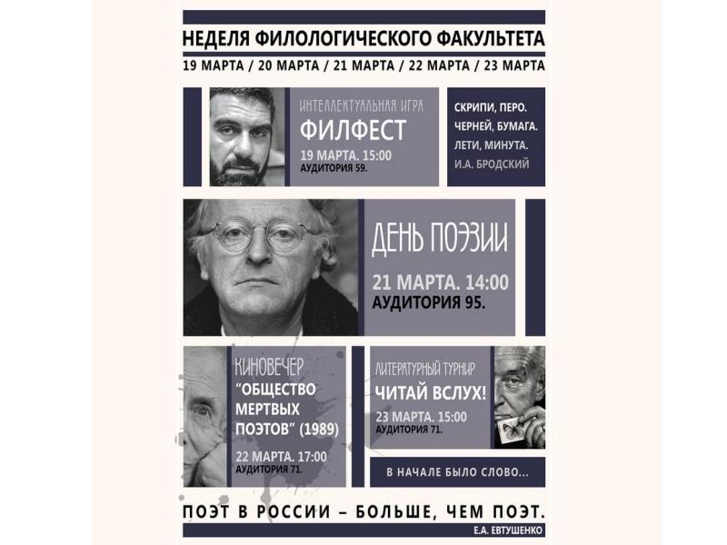 Открытием литературной недели стала сегодняшняя интеллектуальная игра «Филфест». В среду студенты будут читать стихи в рамках «Дня поэзии», а в четверг посмотрят фильм на киновечере «Общество мертвых поэтов».