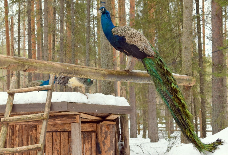 Павлин - птица южная, в основном обитает в Индии и Иране. Но, как рассказали на вотчине волшебника, к суровым условиям Вологодской области адаптировалась хорошо. До минус 20 градусов питомцы находятся в вольере и в теплые помещения не переезжают. Так и было до середины января, пока не ударили сильные морозы. Когда столбик термометра опустился ниже 20 градусов, было решено перевести птиц в теплое помещение, где они и провели остаток зимы.