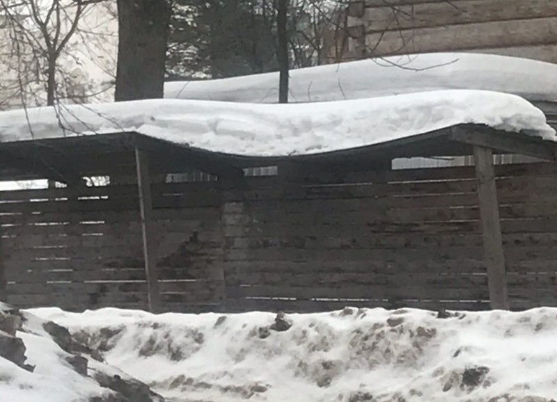 В этом году зима выдалась снежная. И сугробы лежат не только на улицах, но и на крышах зданий и деревянных лесах, установленных рядом с идущей стройкой. Именно такой проход установлен рядом с галереей "Красный мост".