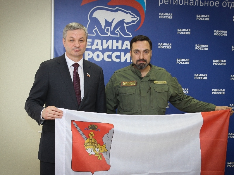 Этот флаг руководителю поисковиков вручил Секретарь ВРО Партии «Единая Россия» Андрей Луценко.