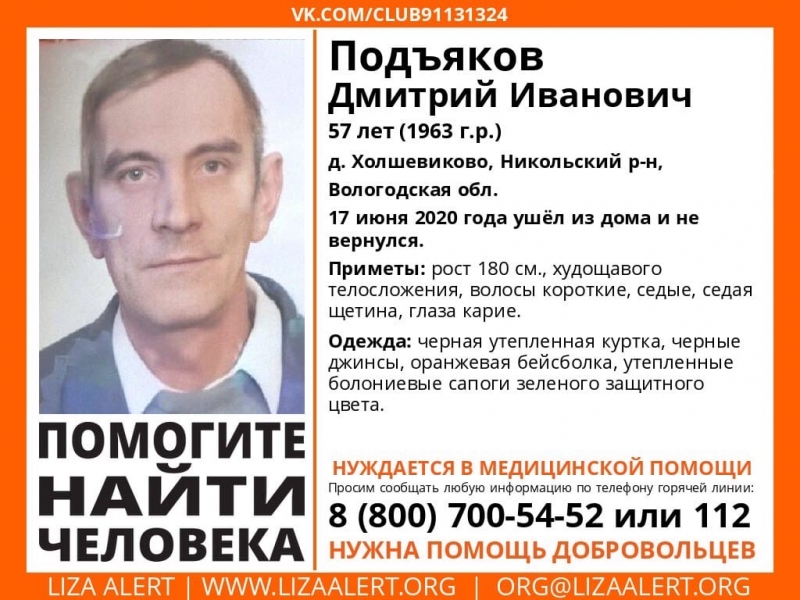 57-летний Дмитрий Подъяков пропал 17 июня. Житель деревни Холшевиково ушел из дома и не вернулся. Ситуацию осложняет то, что мужчине требуется медпомощь, пишет отряд "Лиза Алерт Вологодская область.
