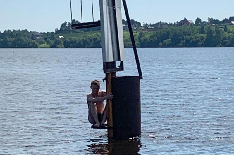 Молодой купальщик застрял на навигационном знаки посреди реки Шексны
