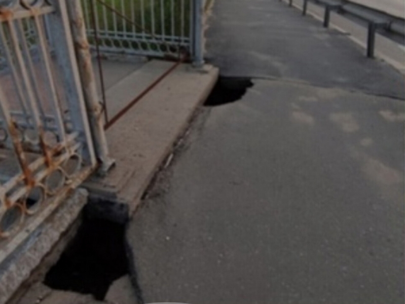 Данный спуск с моста закрыт уже несколько лет. Но проход по тротуару рядом с ямами осуществляется и сейчас. На фотографиях видно, что в покрытии образовались внушительные ямы, которые наиболее опасны в темное время суток.