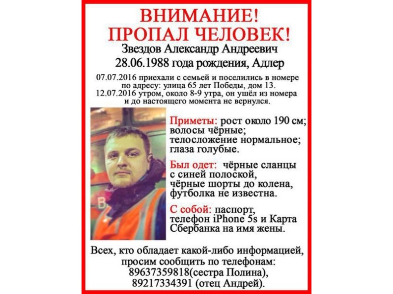 Рост пропавшего 190 сантиметров, волосы чёрные, телосложение нормальное, глаза голубые. В день исчезновения был одет в чёрные шорты до колена, футболку и чёрные сланцы с синей полоской. При себе у Александра были паспорт, телефон и банковская карта на имя жены.
