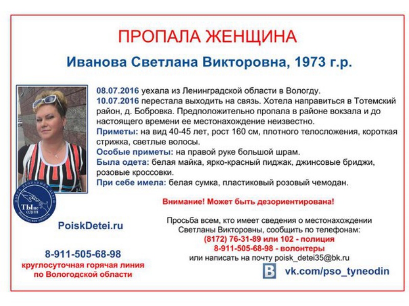 Всех, кто владеет информацией о местонахождении Светланы Ивановой, просят звонить в полицию по номеру 102, волонтёрам - 8(911)505-68-98 или писать на почту poisk_detei35@bk.ru.