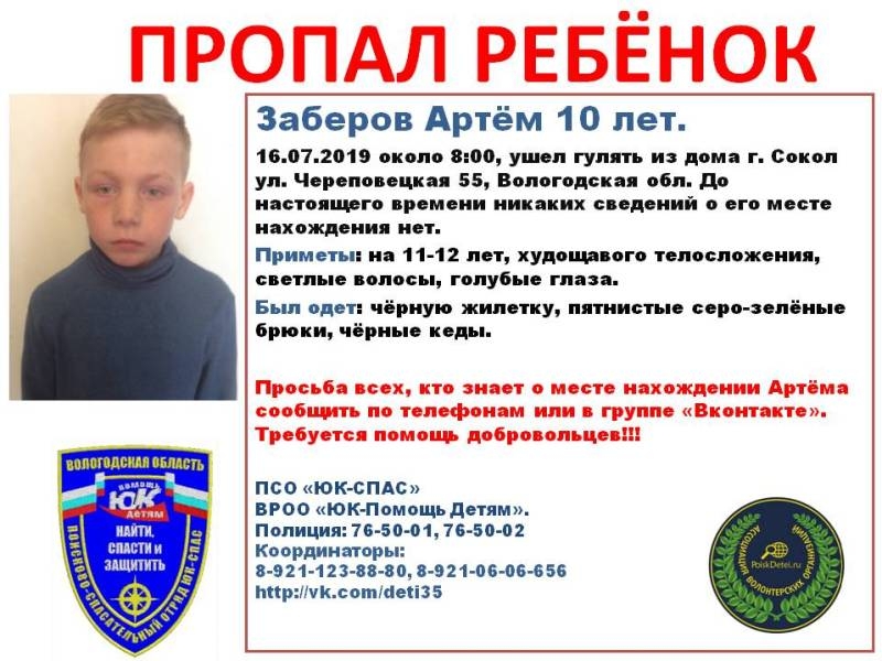 На Вологодчине разыскивают 10-летнего Артема Заберова (по некоторой информации – Зеберова), который около 8 часов утра 16 июля ушел погулять из своего дома на улице Череповецкой и не вернулся.