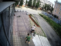 Два молодых человека решили поупражняться в велотриале на крыльце кинотеатра. Известно, что данный объект, как и "Русский Дом", частенько используется велосипедистами и скейтбордистами в качестве полосы препятствий.