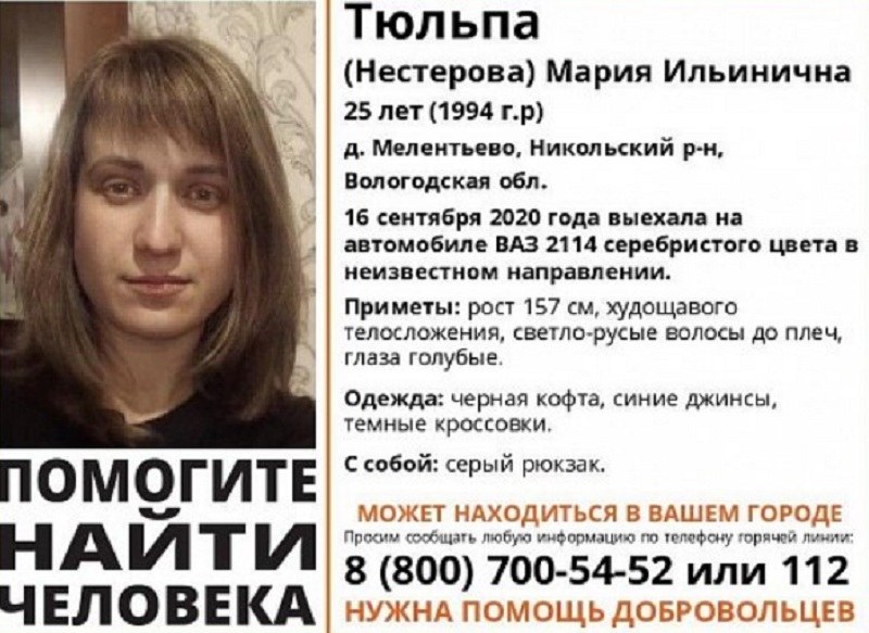 Поисково-спасательный отряд «Лиза Алерт» объявил о розыске молодой жительницы Никольского района Вологодской области. По информации волонтеров, 25-летняя Тюльпа (Нестерова) Мария Ильинична из деревни Мелентьево 16 сентября уехала в неизвестном направлении на серебристом ВАЗ-2114, с тех пор о ней нет никаких известий.
