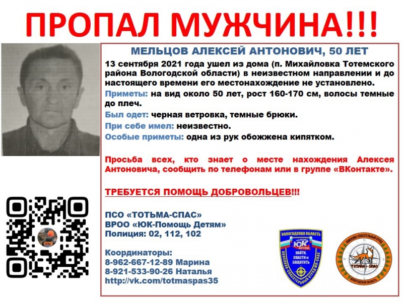 50-летний Алексей Мельцов пропал еще 13 сентября. Тогда он ушел из дома в поселке Михайловка. С тех пор о мужчине нет вестей. ПСО «Тотьма-спас» опубликовал информацию о поиске.