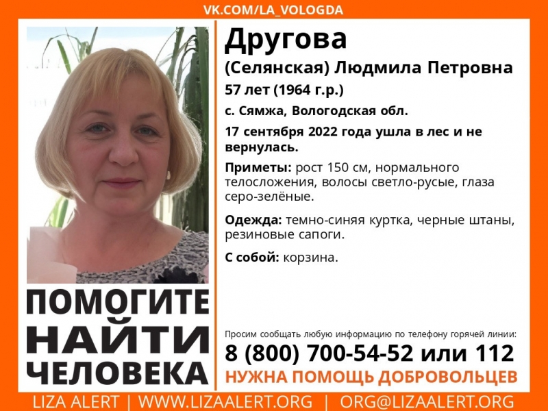 В Сямженском районе заблудилась 57-летняя женщина. Она уже две ночи провела в мокром и холодном лесу. Пенсионерка ушла 17 сентября и не вернулась. Объявлен сбор на поиск. ПСО «Лиза Алерт» публикует приметы пропавшей.