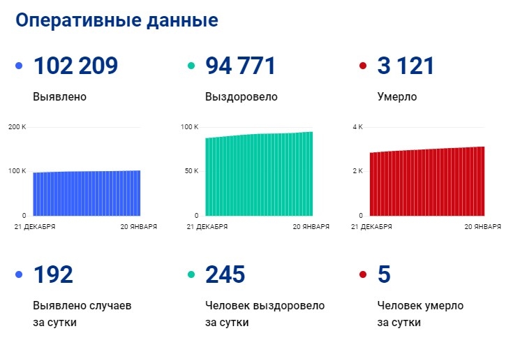 За сутки выявили 192 новых случая, общее количество превысило 102 тысячи. Вылечились 245 пациентов за сутки и 94,7 тысячи всего. Таковы данные на портале стопкоронавирус.рф.