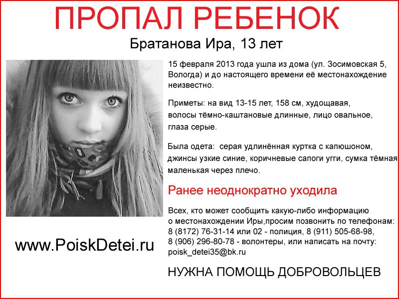 ИА «СеверИнформ — Новости Вологды». Эта информация появилась в группе «Поиск пропавших детей. Вологодская область» «Вконтакте». 13-летняя Ирина Братанова ушла из дома 15 февраля. Она живет на улице Зосимовской областного центра. До сих пор о местонахождении