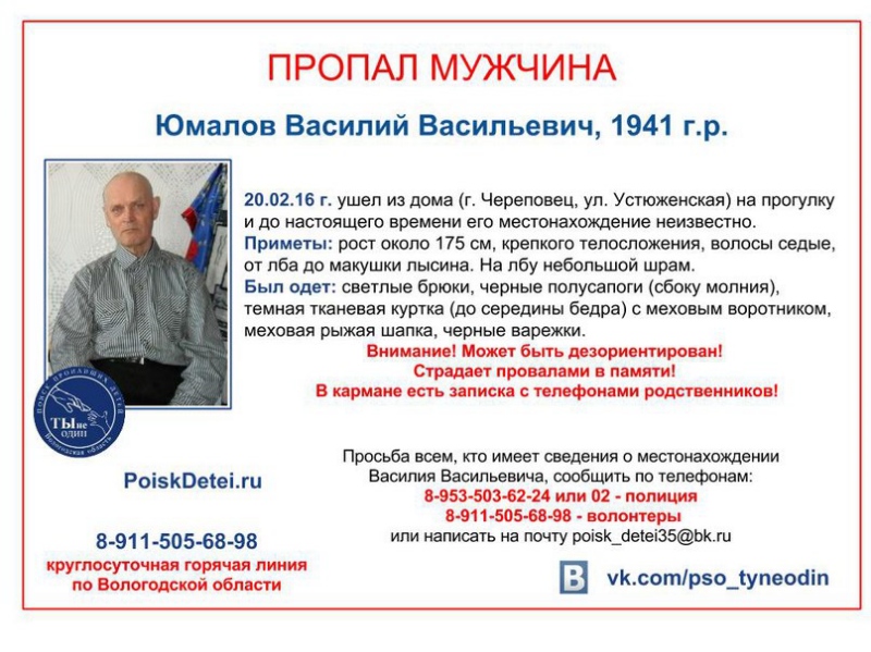 Всем, кто знает о местонахождении Василия Юмалова, просьба обратиться по указанным в ориентировке телефонам.