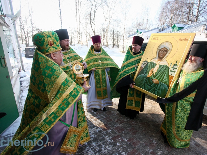 В Череповец прибыли частица мощей и икона блаженной Матроны Московской. Приложиться к святыням пришли сотни горожан. Икону написали в Москве специально для Воскресенского храма Череповца. Поэтому образ будет там находиться постоянно. Также Покровский монастырь передал в дар Череповецкой епархии частицу мощей.
