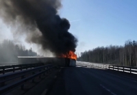 Видео с места ДТП выложили в социальные сети очевидцы. Предположительно, водитель за рулем грузовика уснул, машина потеряла контроль и врезалась в барьерное ограждение. После чего фура опрокинулась и загорелась. Как сообщает источник, водителя успели вытащить из грузовика до того, как началось возгорание.