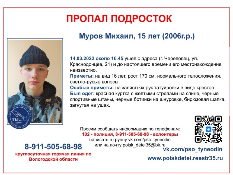 Рост Михаила 170 см, волосы светло-русые. Был одет в красную куртку с желтыми стрелами на спине, спортивные штаны, ботинки на шнуровке и бирюзовую шапку. Особая примета – татуировки в виде крестов на запястьях.