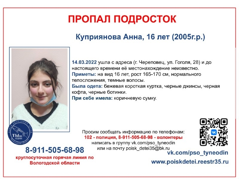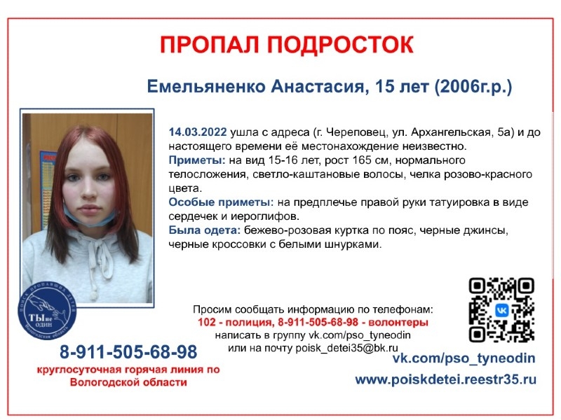 Анастасия была одета в короткую бежево-розовую куртку, черные джинсы и кроссовки. На правом предплечье у пропавшей татуировка в виде сердечек и иероглифов.