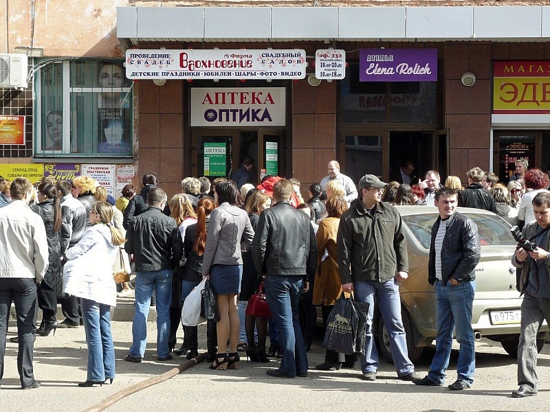 Возле здания собрались несколько десятков человек, наблюдающих за происходящим
