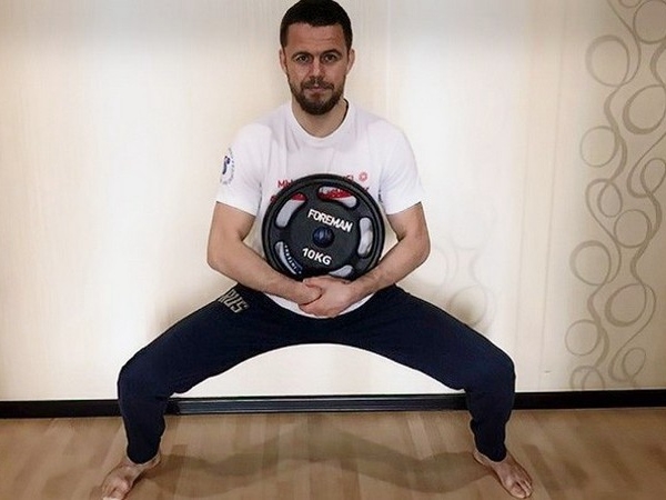 Спортсмен простоял в "стойке всадника" 10 с половиной минут. При этом он держал дополнительный вес 10 килограммов.