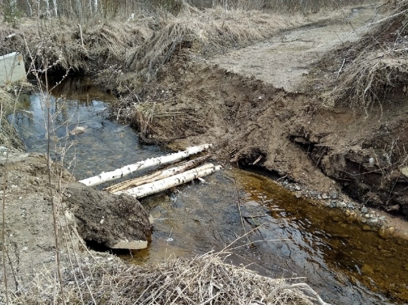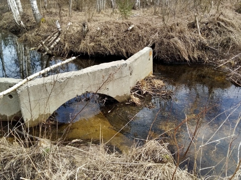 Это место называется Кумилов Мост. Он пролегал над небольшой речушкой. Сейчас транспорту здесь не проехать. Как пишут жители окрестных деревень, разрушенный участок ничем не огорожен.