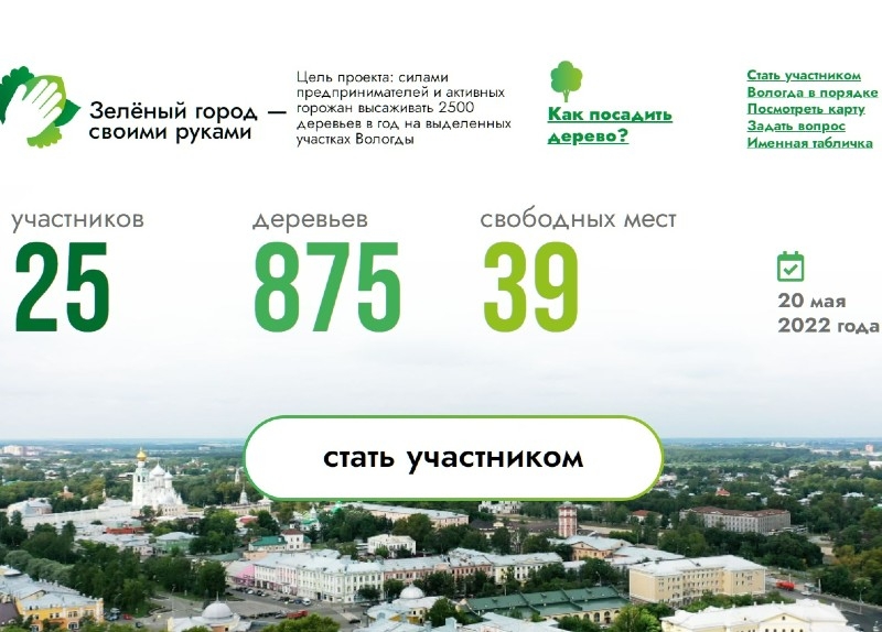 В рамках проекта «Зеленый город своими руками» уже высажено 875 деревьев, по числу лет города. Чаще всего вологжане выбирали рябины – 229 штук, клены - 208 и березы – 131 дерево.