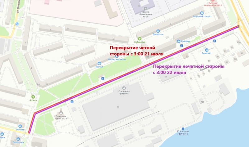 С 3 часов перекроют четную сторону. Движение транспорта, в том числе, общественного разрешат по нечетной стороне, то есть по одной полосе в каждом направлении. С 3 часов 22 июля закроют две полосы со стороны спичечной фабрики. Транспорт пустят по четной стороне в обоих направлениях, пишет департамент ЖКХ.