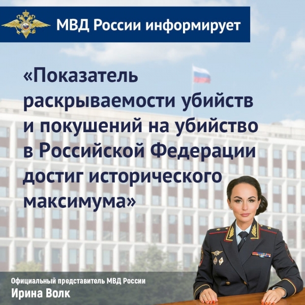 Показатель раскрываемости убийств и покушений на убийство в Российской Федерации достиг исторического максимума. Анализ состояния преступности в Российской Федерации показывает, что органы внутренних дел уверенно контролируют оперативную обстановку в стране. Несмотря на существенный некомплект личного состава, подразделения МВД России решают поставленные задачи по защите прав и законных интересов граждан, укреплению правопорядка, предупреждению, пресечению и раскрытию преступлений и правонарушений.