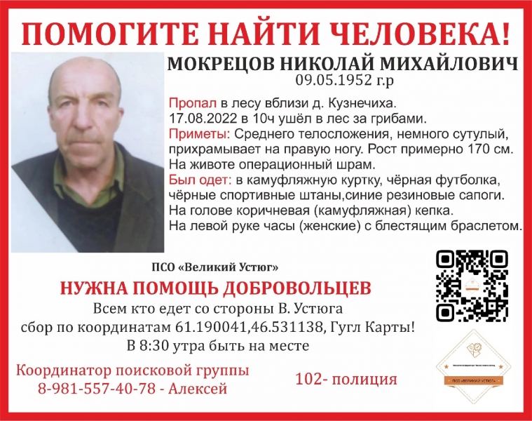 Пенсионер ушел за грибами еще 17 августа. До сих пор местонахождение 70-летнего жителя деревни Кузнечиха до сих пор не установлено. ПСО «Великий Устюг» объявил сбор на поиск.
