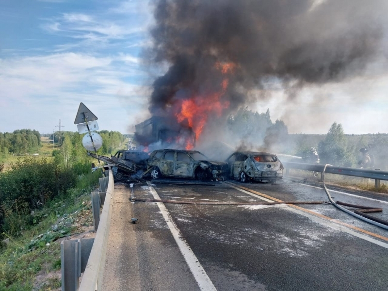 Восемь автомобилей загорелись после столкновения в Вологодской области