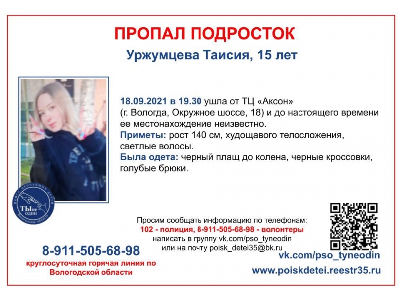 15-летняя Таисия Уржумцева потерялась 18 сентября. Около 19 часов ушла от ТЦ «Аксон». До сих пор о местонахождении подростка ничего не известно. ПСО «Ты не один» распространяет информацию о поиске.