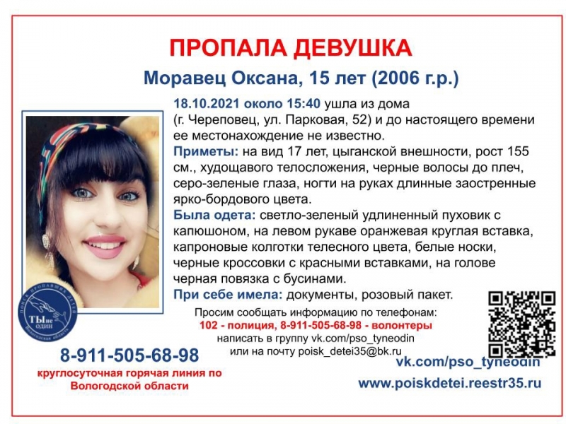 От Оксаны Моравец нет вестей с понедельника, 18 октября. Около 15:40 школьница ушла из дома на Парковой, 52. С тех пор местонахождение неизвестно. К поискам подключились волонтеры.