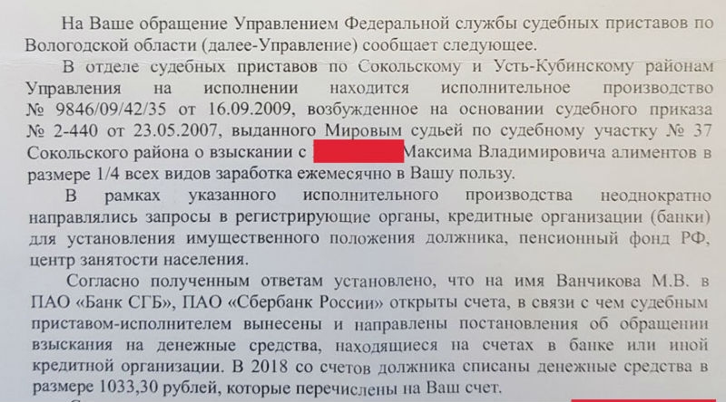 Мужчина накопил большой долг на содержание ребенка. В итоге мать их общего ребенка обратилась к судебным приставам. Те нашли у должника счета в двух банках, с которых в пользу истицы было списано чуть более тысячи рублей. Самого нерадивого отца найти оказалось не так просто. По месту прописки он не проживал, поэтому его объявили в розыск. Когда сокольчанин попался, суд назначил ему административное наказание в виде 20 часов обязательных работ. Однако и это не помогло: мужчина по-прежнему не платил деньги на содержание ребенка. Тогда женщина решила обратиться в приемную депутата Законодательного собрания Вологодской области Антона Холодова.
