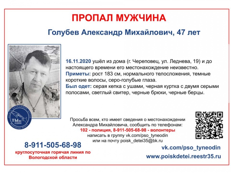 Всем, кто знает что-то о местонахождении Александра Голубева, просьба обратиться по указанным телефонам, сообщает ИА "СеверИнформ".