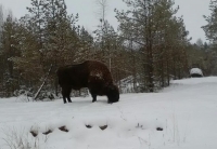 Зимой зубры самцы покидают стадо, отправляются на одиночный прокорм, чтобы не объедать семью. Некоторые выходят к деревням. Вот и этот "зубрик", именно так местные его называют, кормится у одного из кубенских поселений. Егеря ему персонально завозят сено и комбикорм, а жители приносят хлеб и картофельные очистки. Так животное и зимует.