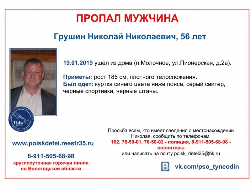 Приметы пропавшего: рост 185 см, плотного телосложения, в момент пропажи был одет в синюю куртку ниже пояса, серый свитер, черные штаны и спортивки. Всех, кто что-то знает о местонахождении Николая Грушина, просят позвонить по телефонам полиции: 102, 76-50-01, 76-50-02, либо на горячую линию волонтеров ПСО: 8911-505-68-98, также можно написать на электронную почту poisk_detei35@bk.ru, сообщает ИА «СеверИнформ».
