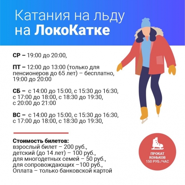 Каток работает четыре дня в неделю. В среду только один час, в пятницу днем он открыт только для пенсионеров, вечером могут подойти население минус 65. В субботу предусмотрено пять заездов по часу, в воскресенье - четыре.