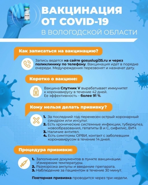Иммунизации против коронавирусной инфекции подлежат вологжане старше 18 лет. Списки формируются через областной портал Госуслуг,а также через поликлиники по телефону регистратуры.