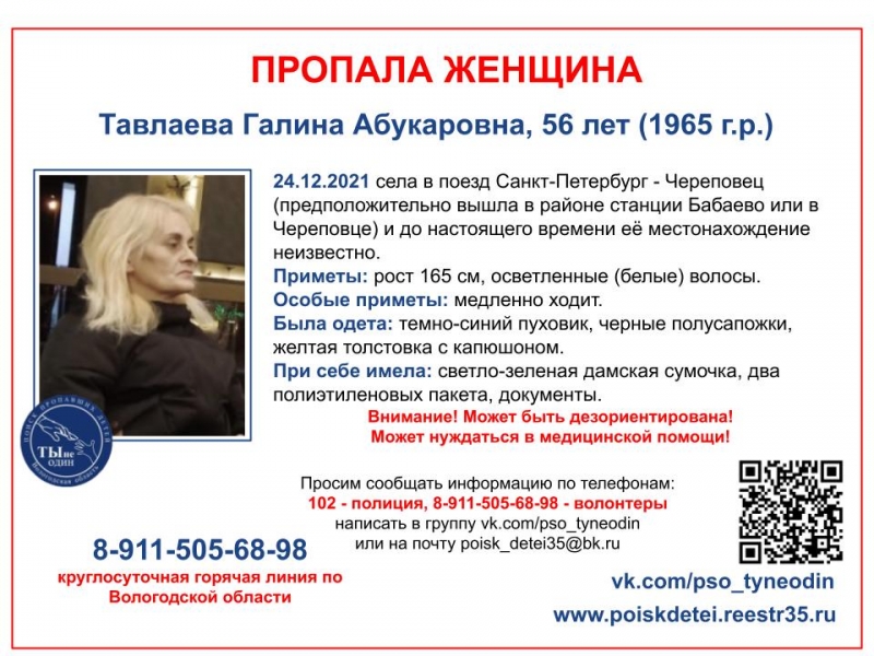 24 декабря женщина вышла из поезда, следующего из северной столицы в город металлургов. Предположительно, 56-летняя Галина Тавлаева вышла в районе Бабаево или в Череповце. Местонахождение до сих пор не установлено. ПСО «Ты не один» распространяет информацию о поиске.