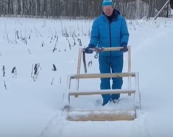 Ручная конструкция, подобная ратраку, получила ласковое название «кряк-кряк». С помощью деревянной волокуши помогает организовать лыжню автор изобретения Евгений Ерков. Он сделал необычный подарок жителям родной деревни Обросово. Нет никакой надежды, что современная техника когда-либо пройдется по сугробам этой глубинки. Поэтому в ход идет смекалка и огромное желание заниматься спортом.