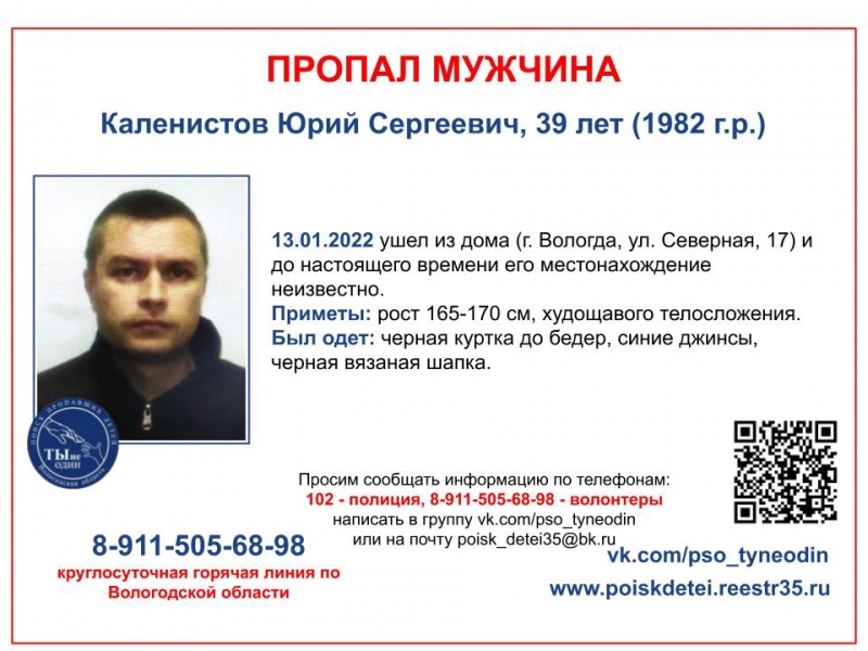 Юрий Каленистов ушел из дома 13 января. 39-летний мужчина живет на Северной, 17. ПСО «Ты не один» просит помощи в поисках пропавшего.