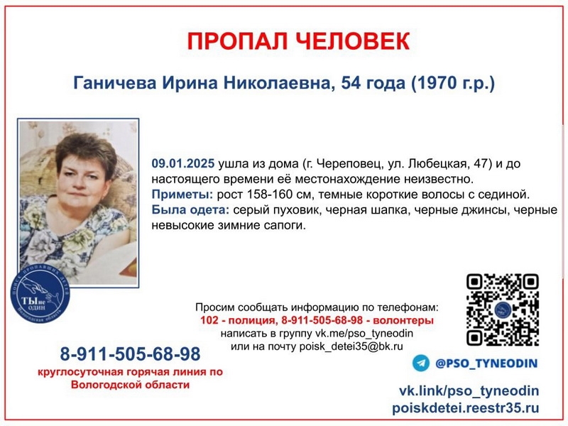 Она череповчанка, жила на Любецкой, 49. Вечером вышла из дома и пропала. О ней известно, что была одета в пуховик, на ней были джинсы, шапка и зимние сапоги. Сама Ирина невысокая, волосы с сединой.