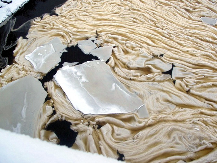 "Подобные массы могут образовываться при отрицательных температурах при обработки древесины щелочью, то есть при производстве бумаги, - предполагает эколог. - То есть, возможно, где-то вверху по течению работает ЦБК. Но проверить эту версию возможно, лишь только собрав пробы этой массы. Сейчас уже ее нет.