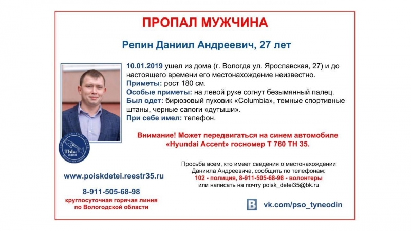 Напомним, 27-летний вологжанин пропал больше месяца назад. Он ушел 10 января из дома на улице Ярославская, и с тех пор родные Даниила не видели его. Мужчину искали близкие, знакомые, волонтеры, полиция, но все попытки не принесли успеха.